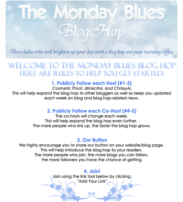 Join us every Monday and take those blues away! If you are interested in becoming a co-host for the The Monday Blues Blog Hop feel free to email us at mondaybluesbloghop(at)gmail(dot)com